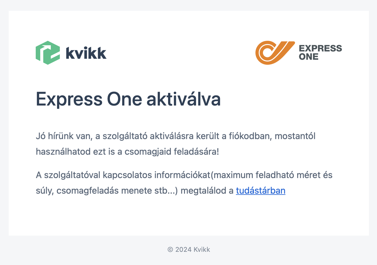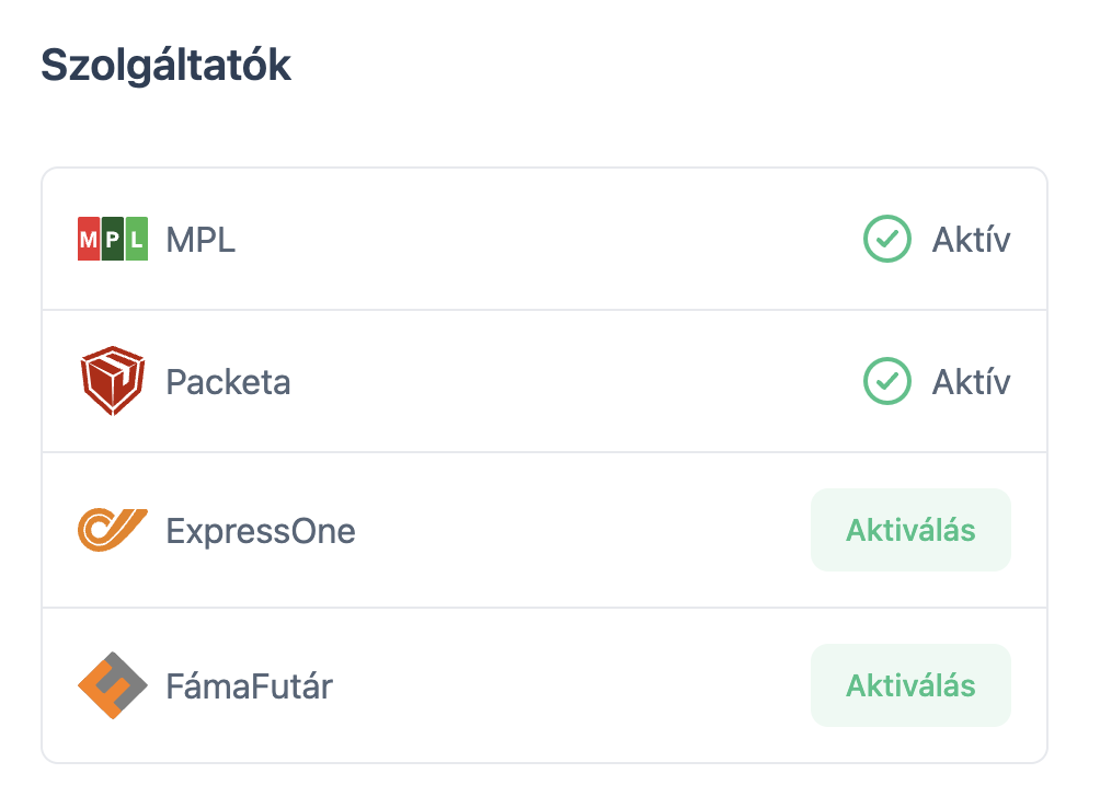 Itt az adott szolgáltató mellett kattints az aktiválás gombra és elindítjuk a regisztrációs folyamatot, aminek során az adott szolgáltató rendszerében regisztrálni fogjuk a feladási címed. Miután ez megtörtént, e-mailben értesítünk a szolgáltató aktiválásáról, és ettől a ponttól kezdve használhatod élesben ezeket a futárszolgálatokat is: