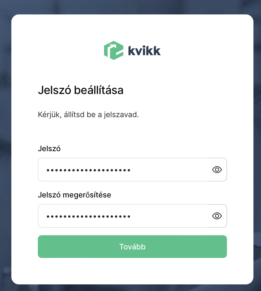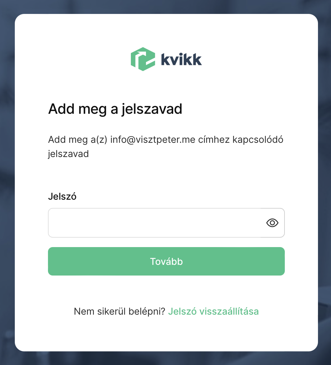 Első lépésként ha be vagy jelentkezve az app.kvikk.hu oldalon, jelentkezz ki(jobb felül a Kilépés gomb). A megjelenő bejelentkezés oldalon add meg az e-mail címed, majd a következő lépésben válaszd a jelszó