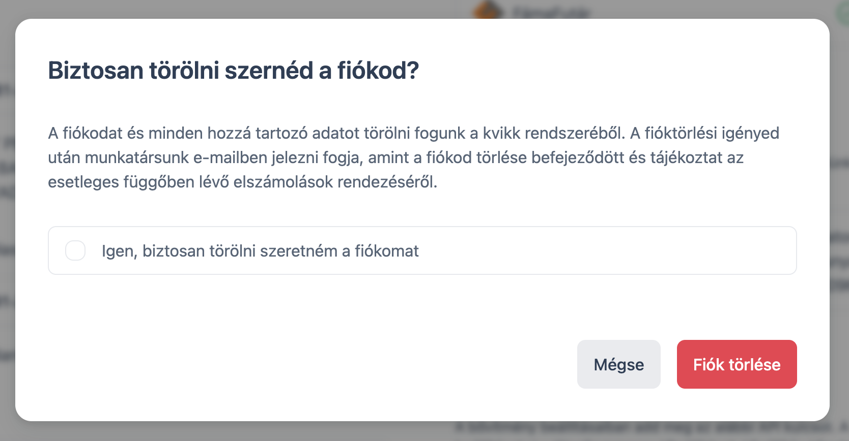 A fiókod törléséhez jelentkezz be az app.kvikk.hu oldalon és a beállítások fül alatt kattints a fiók törlése gombra jobb alul. A felugró ablakban erősítsd meg a fióktörlési szándékodat. E-mailben értesítünk 1-2 munkanapon belül, amint megtörtént a fiókod deaktiválása és az adatait törlése.