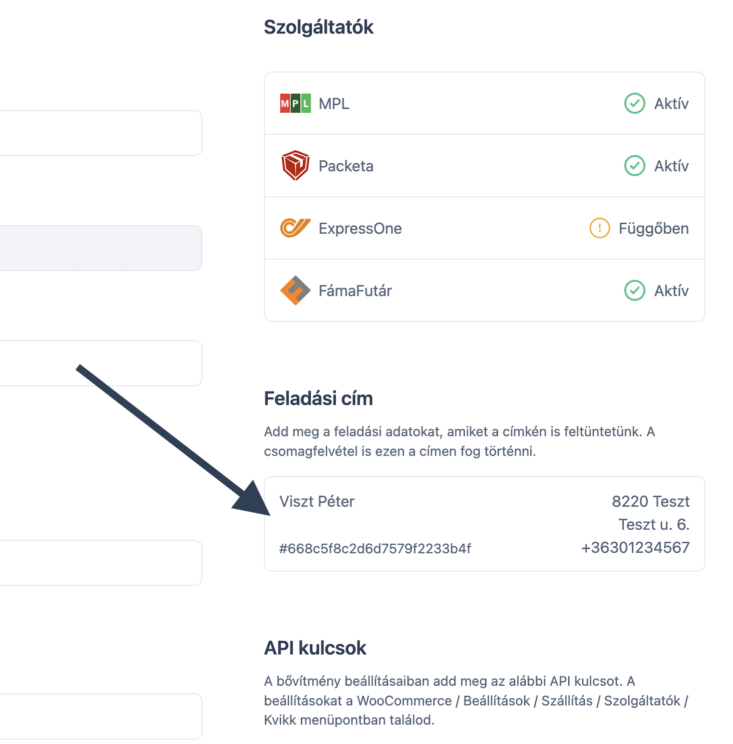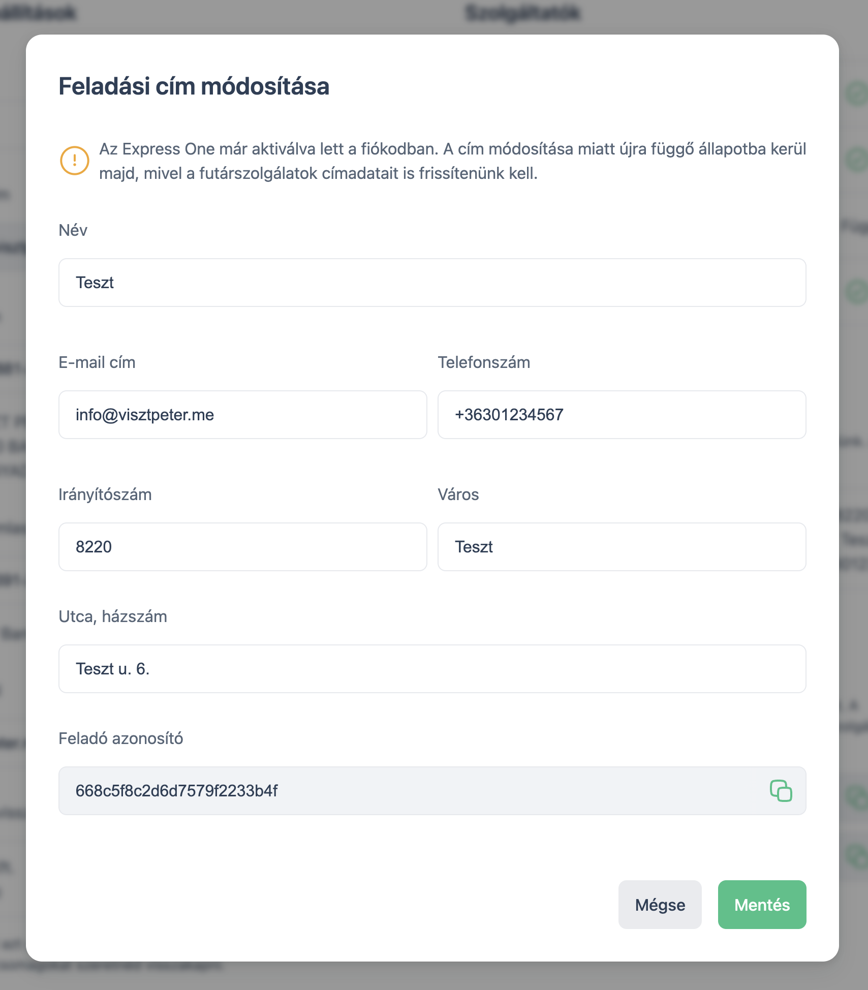 A regisztráció során megadott feladási címet a fiók beállításokban tudod módosítani, viszont van néhány követelmény: ha kértél FámaFutár hozzáférést, akkor addig nem tudod módosítani a feladási címet, amíg az adott szolgáltatónál engedélyezve lett a fiókod. Ezután van lehetőséged módosítani a címet, ilyenkor ismét függőben lévő állapotba kerülnek az említett szolgáltatók addig, amíg a módosított cím rögzítésre nem kerül. A cím módosításához kattints a feladási címre a beállításokban: