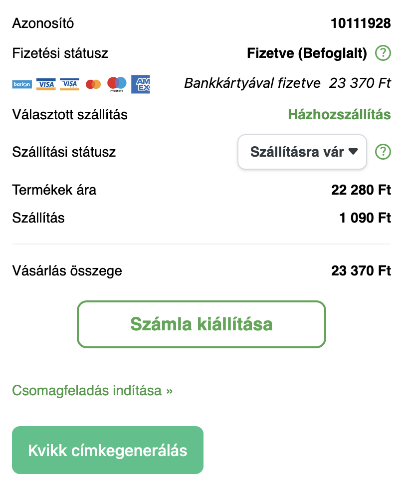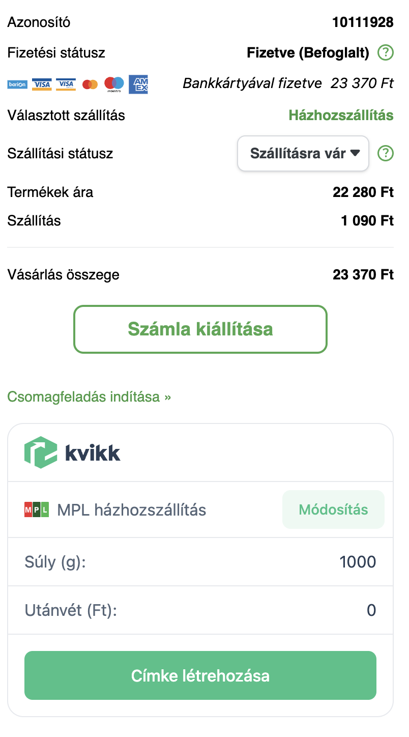 Meska esetében a Boltom / Eladások menüben található listában látható a Kvikk címkegenerálás gomb:
