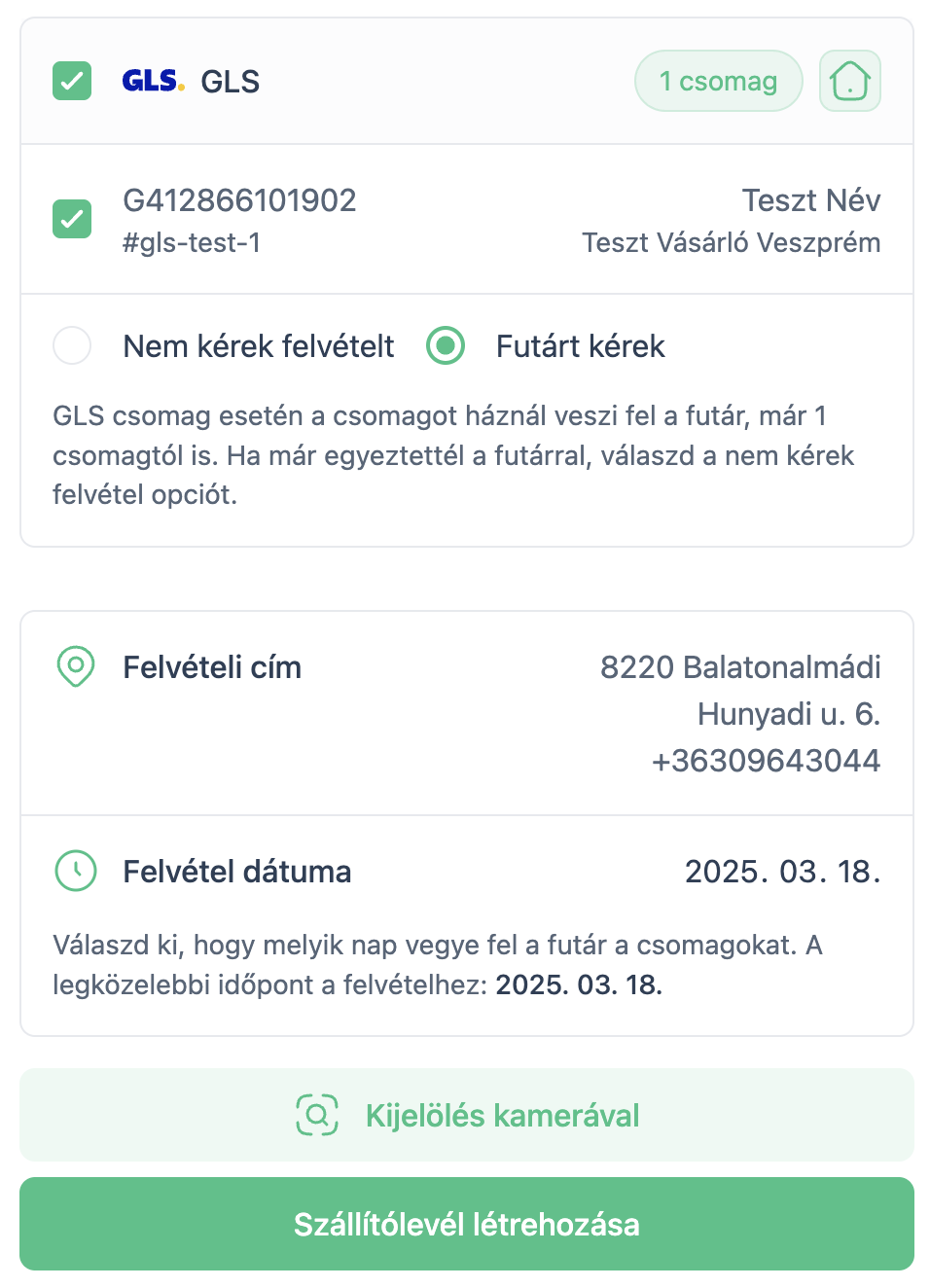 A csomagokat átadhatod a GLS futárnak a szállítólevél lezárása után. Ha személyesen ismered a futárt, vagy megvan a telefonszáma, nyugodtan egyeztethetsz vele a felvételről. Ha nem ismered, akkor a szállítólevél létrehozásakor válaszd a futárhívás opciót és megadhatsz egy felvételi dátumot: