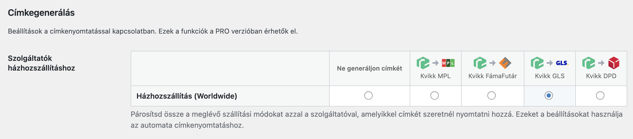 Házhozszállítás esetén pedig hozz létre egy új szállítási módot. Ez lehet a beépített átalánydíj, vagy bármilyen más szállítási mód bővítmény, például az ingyenes Extra Szállítási Módok, amiben ugyanolyan feltételrendszerel tudsz árakat beállítani, mint a csomagpontok esetében. A szállítási mód neve bármi lehet, de érdemes a GLS szót beleírni, hogy a vásárló tudja, mivel fogsz szállíteni. Ha ez megvan, akkor párosítsd össze az új szállítási módot a Kvikk GLS szolgálatóval a WooCommerce / Beállítások / Szállítás / Címkék menüben: