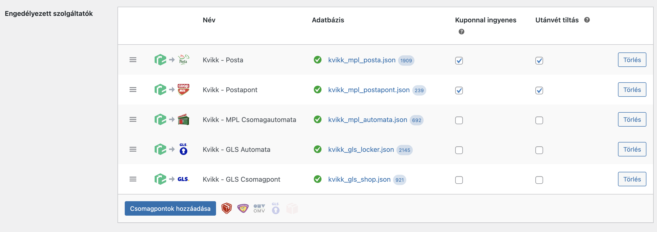 A csomagpontok beállításához egyszerűen add hozzá a Kvikk GLS Automata és Kvikk GLS Csomagpont opciókat az engedélyezett szolgáltatókhoz(WooCommerce / Beállítások / Szállítás / Csomagpontok) és a részletes árazásnál határozd meg a szállítási mód árát:
