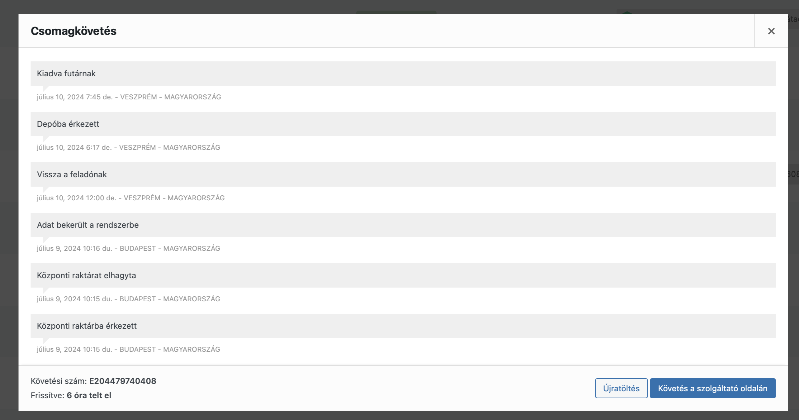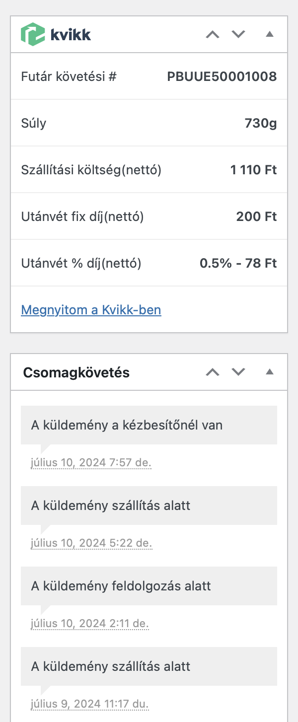Egy rendelésen belül pedig láthatod a futár által generált követési számot is a Kvikk adatok dobozban, illetve itt is láthatod a csomagkövetési adatokat: