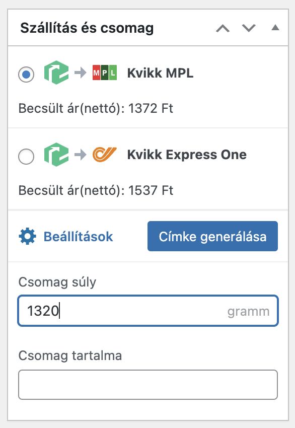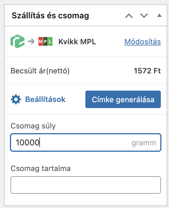 A Csomagpontok és Címkék bővítmény beállításaiban találsz opciót arra is, hogy korrigáld a csomag súlyát automatikusan, így hozzá tudod adni a csomagolás súlyát a termékek súlyához és nem kell külön-külön lemérned a csomagokat. Ebben a dobozban láthatod is a kalkulált szállítási árat:
