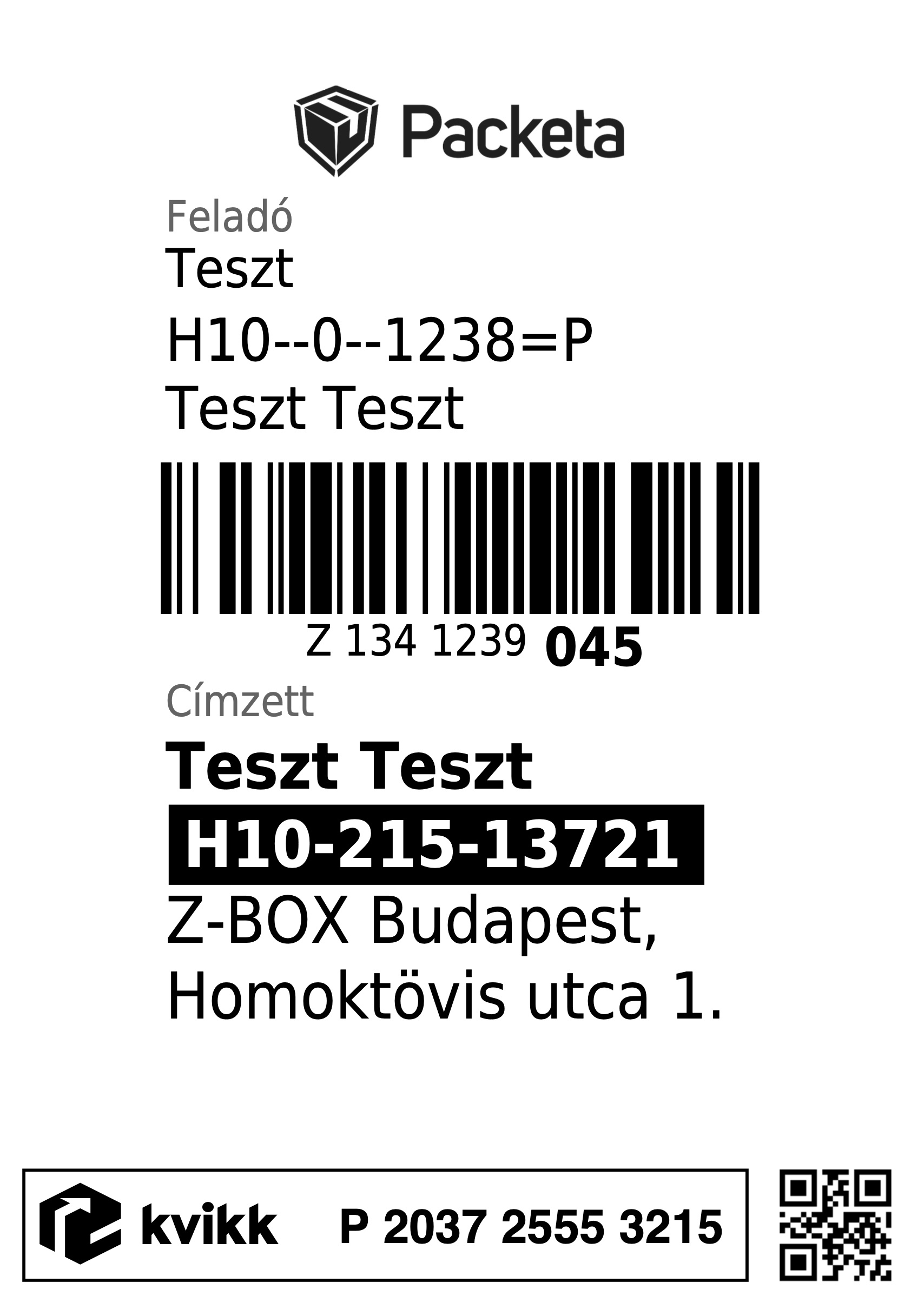 Ha minden sikerült, kattints a Nyomtatás gombra, ahol a beállításoknak megfelelően egy A4-es lapra fog 4db A6-os címkét elhelyezni, vagy külön-külön oldalra rak egy A6-os címkét(például ha címkenyomtatót használsz). Bármelyik Kvikk-es szolgáltatót használod, a címkeformátum egységes lesz és az alján látni fogod a Kvikk által generált csomagszámot is, például: