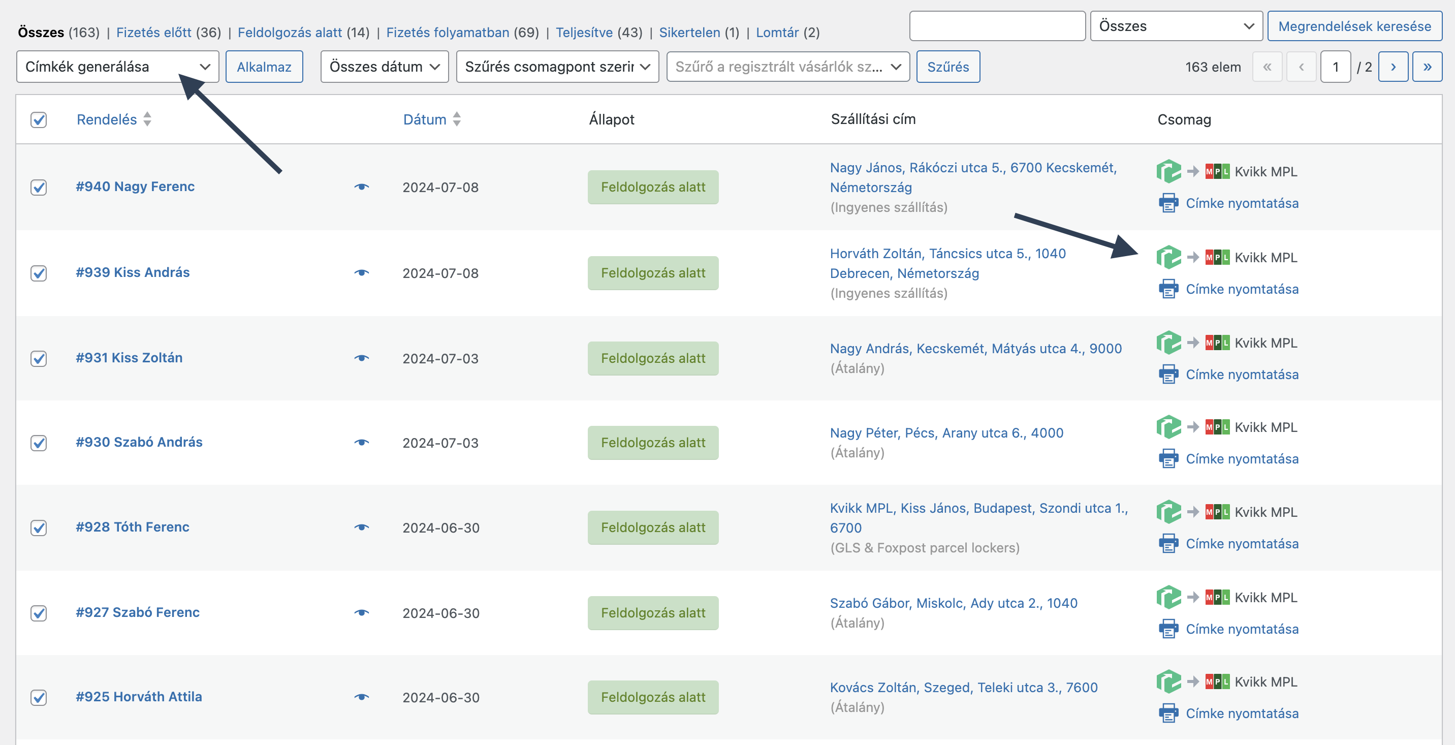 Ha sikerült összekötnöd a Kvikk-et a WooCommerce webáruházaddal, készen állsz a csomagok létrehozására. A WooCommerce Csomagpontok és Címkék bővítmény segítségével készítsd el a címkéket. Részletesen erről itt olvashatsz, mert több megoldás is van(csoportos művelettel, egyesével, automatán), most a csoportos műveletekkel történő kerül bemutatásra.