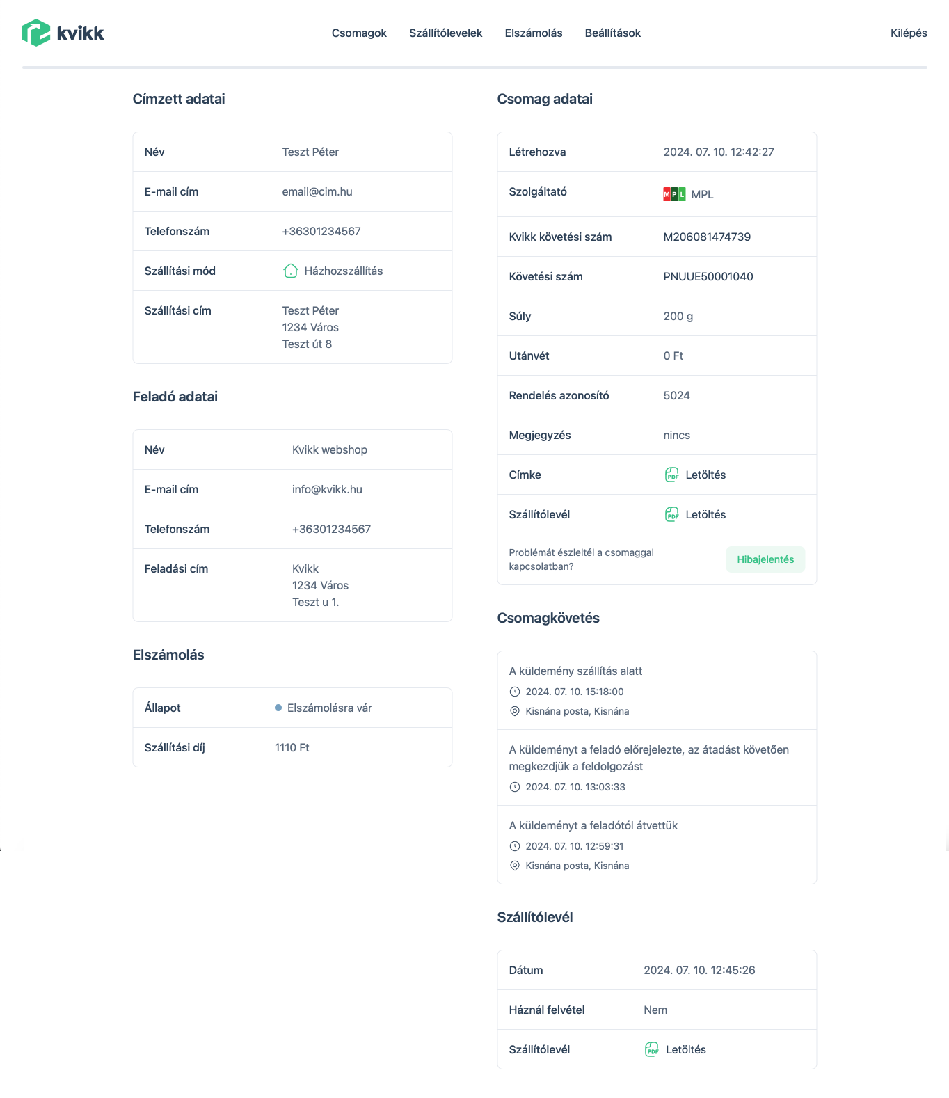 A csomagok automatikusan bekerülnek az app.kvikk.hu-s felületre is. Itt táblázatos nézetben láthatod az összes fontos adatot, de a követési számra kattinva még részletesebb nézetet kapsz:
