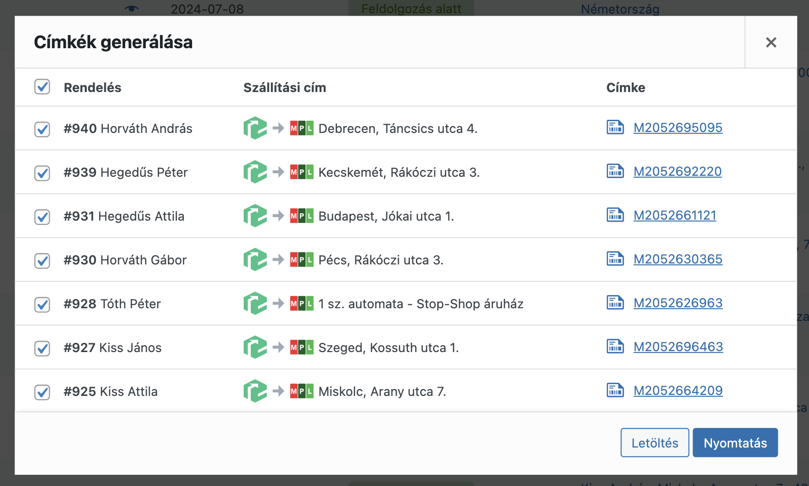Ha látod a Kvikk logót, akkor jelöld ki a rendeléseket és a csoportos műveleteknél válaszd a Címkék generálása opciót. Ha több Kvikk-es szolgáltató is van a listában, az nem jelent problémát, nyugodtan kijelölheted őket egyben. A felugró ablakban automatikusan elkezdi létrehozni a címkéket a kijelölt rendelésekhez: